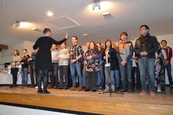 この3月で東北大震災から5年を迎える節目の年です。今年は「震災」をテーマに「シンサイミライノハナ・プロジェクト」にし、多くの方がメッセージを寄せてくれました。メッセージカードをはり合わせるときれいな黄色い花になり、会場に彩りました。またフランス人生徒さんが復興応援歌「花」を合唱し、盛り上げてくれました。