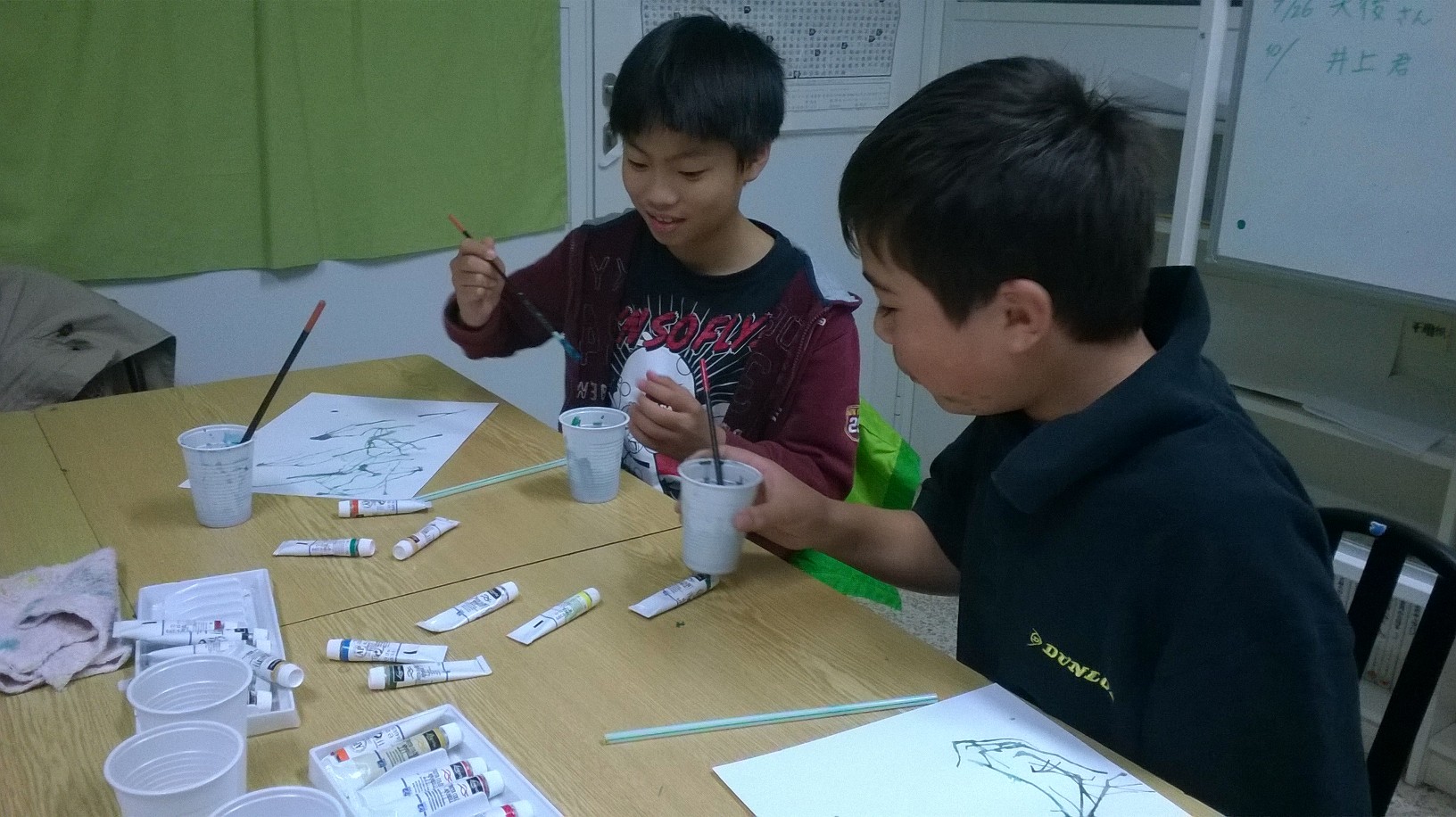 (日本語) 授業レポート(5-6年) 2015年9月 執筆者 Ecole Japonaise du Nord-Pas de Calais | 9月 17, 2015 | 授業レポート | コメント0件 9月12日 今月は国語の時間に北原白秋の「からたちの花」を勉強しています。この詩の世界を深く感じ取る目的で、4時間目の図工でからたちの絵を描きました。 技法は吹き絵です。色作りをしながらどんな色だろうかと想像しながら、いろんな色を作っていました。また、とげがたくさんある様子を描くためにみんな苦戦していましたが、詩に描かれている情景を忠実に表現していて素晴らしかったです。 来週は白い花を貼り付け、詩を書写して一つの作品として完成します。