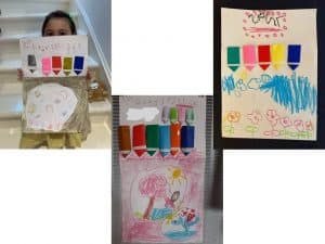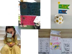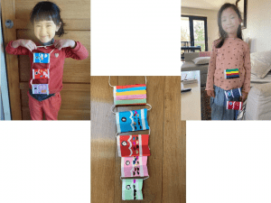 季節の工作や、行事に合わせた制作活動を行います。この時、ZOOMの画面と音声はいったん切って、各自集中して活動できるようにします。事前に、先生から保護者にメールで必要なものや、参考にする動画またはサイト等を送っていただいているので、生徒と保護者が一緒に工作を行います。先日は、母の日のプレゼントを作ったり、こいのぼりを作ったりしました。工作が早く終わった生徒は、事前に送られたプリントをしたり、ダンスや、折り紙などをしたりします。