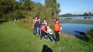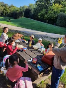 そして、子供たちが待ちに待った遠足の日がやってきました。今日は、秋晴れの素晴らしい天気に恵まれ、学校近くのエロン湖周辺を散策しました。幼稚部・小学部・中学部が、4つのグループに分かれ、クイズラリーをしたり、制作活動をしたりしました。普段とは違う生徒同士の交流を図るため、縦割りのグループ編成でした。